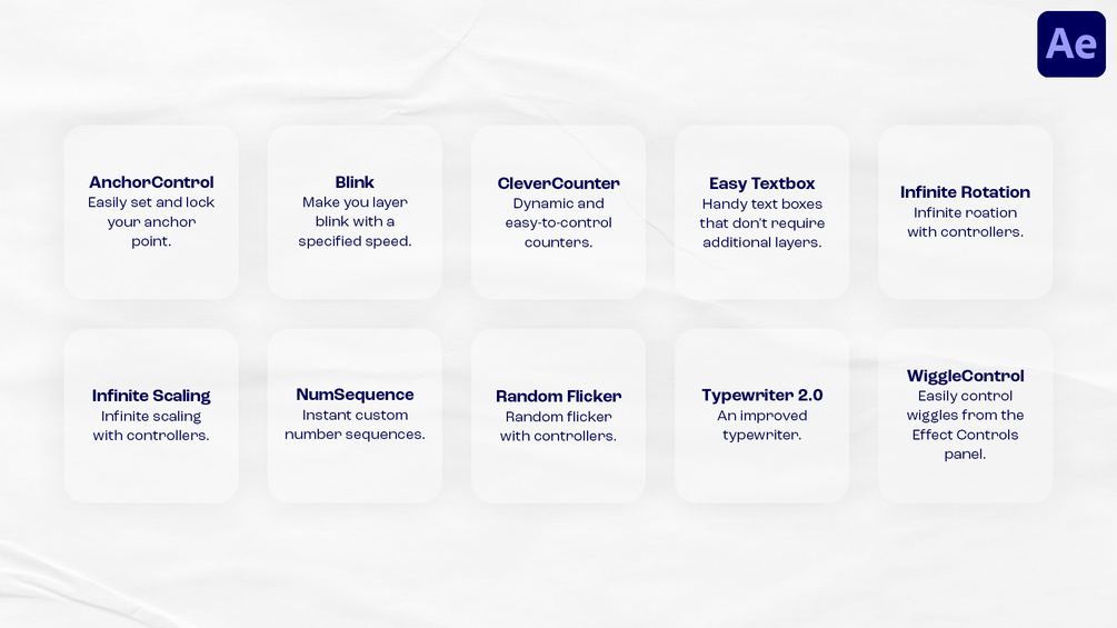 - Typewriter 2.0: An improved typewriter effect with which the layer bounds represents the layer's true size. Particularly useful if you work with the sourceRectAtTime() expression.